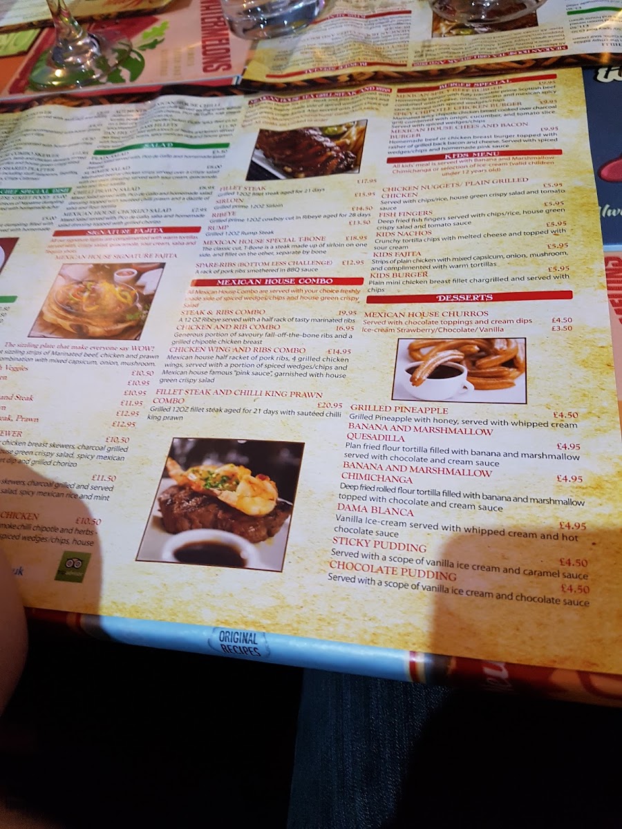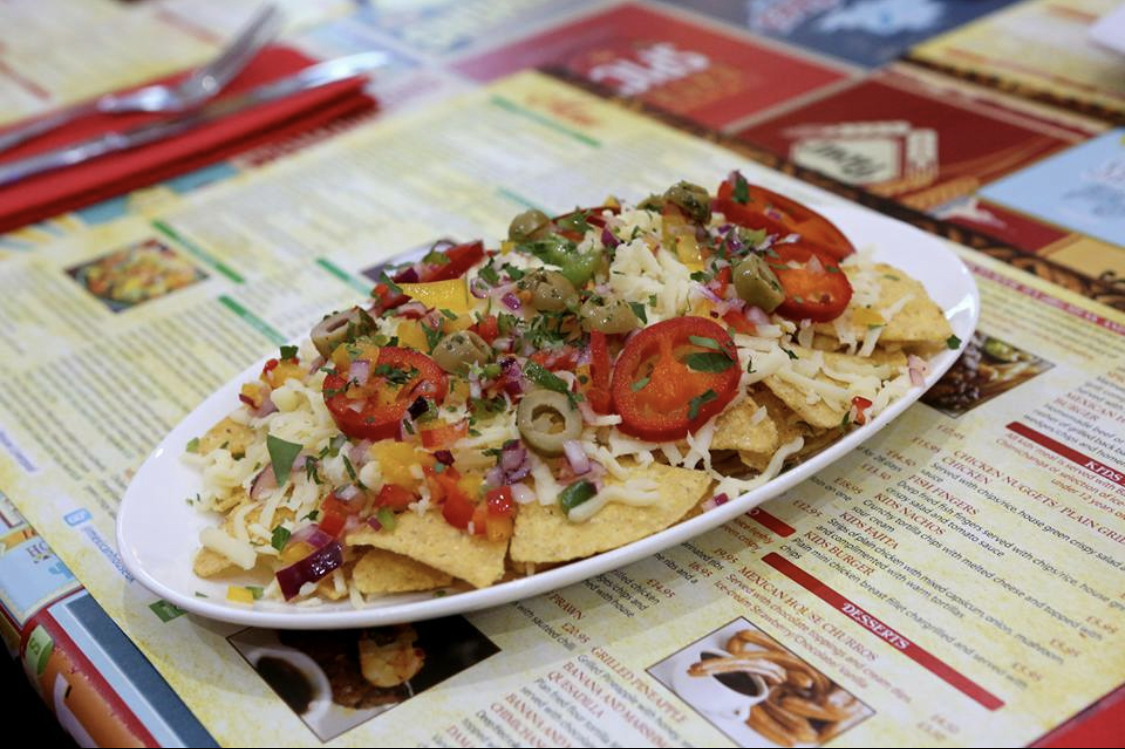 Starter:garlic bread, halloumi fingers, jalapenos rellenos, albondigas or Mexican chipotle dippers; Mains: chimichanga, Mexican house burritos or trio of tacos